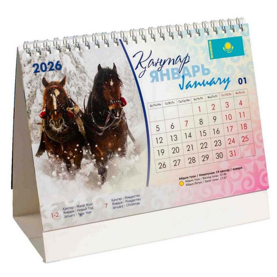 Настольный перекидной календарь на спирали — удобный помощник для офиса и дома. Компактный размер позволяет разместить его на любом рабочем месте, а плотная картонная подставка обеспечивает устойчивость. Дизайн, посвящённый Году Лошади, делает календарь стильным элементом рабочего стола. Печать выполнена на двух языках: казахском и русском.