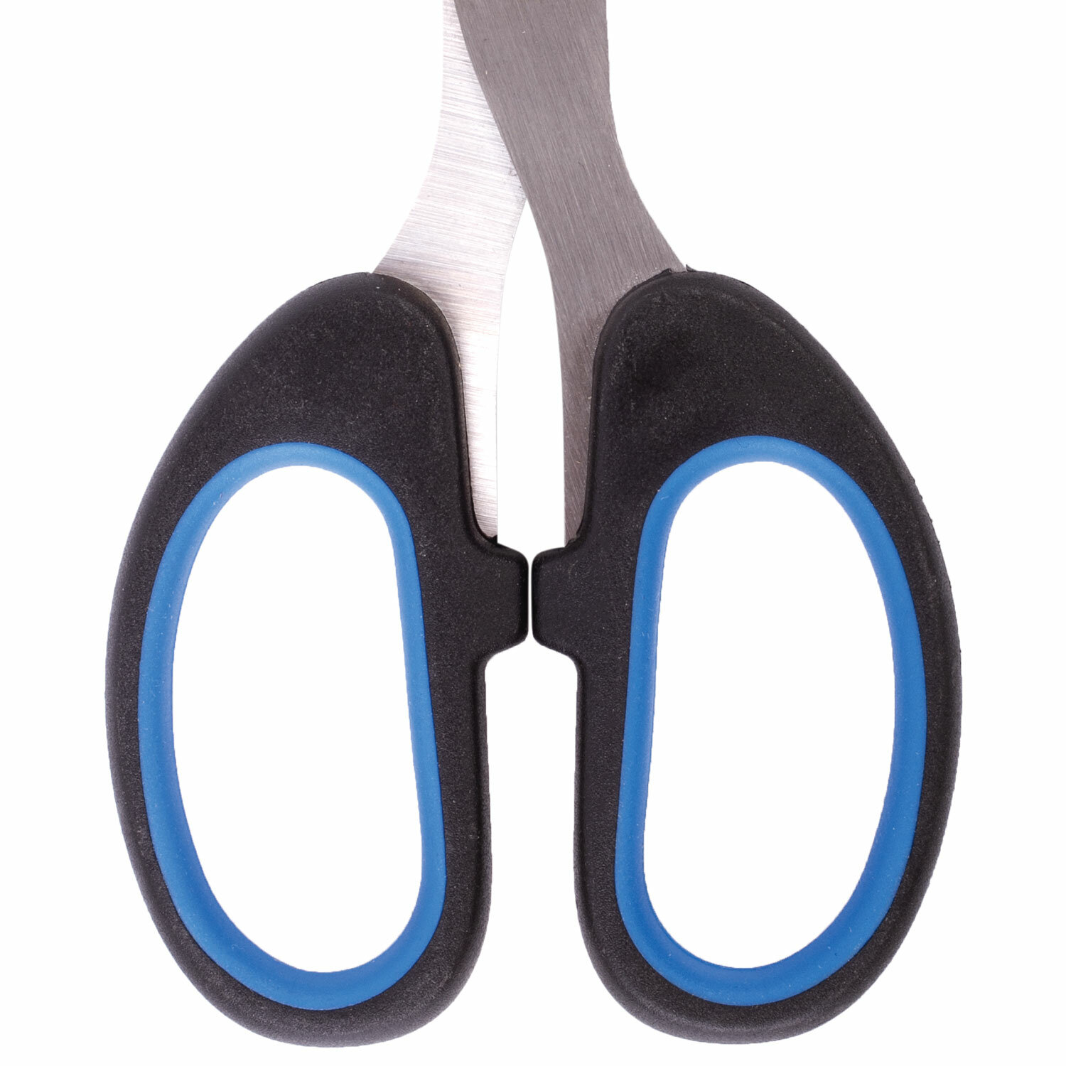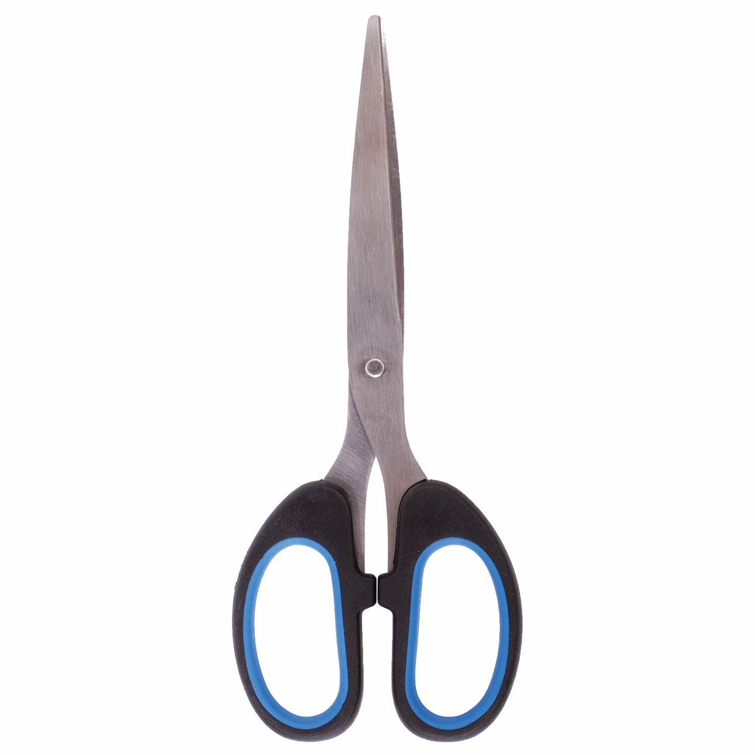 Симметричные эргономичные ручки выполнены из мягкого пластика с резиновыми вставками, что обеспечивает надёжный захват и снижает нагрузку на руку при продолжительной работе. Классическая форма делает ножницы универсальными для бумаги, картона и других материалов.