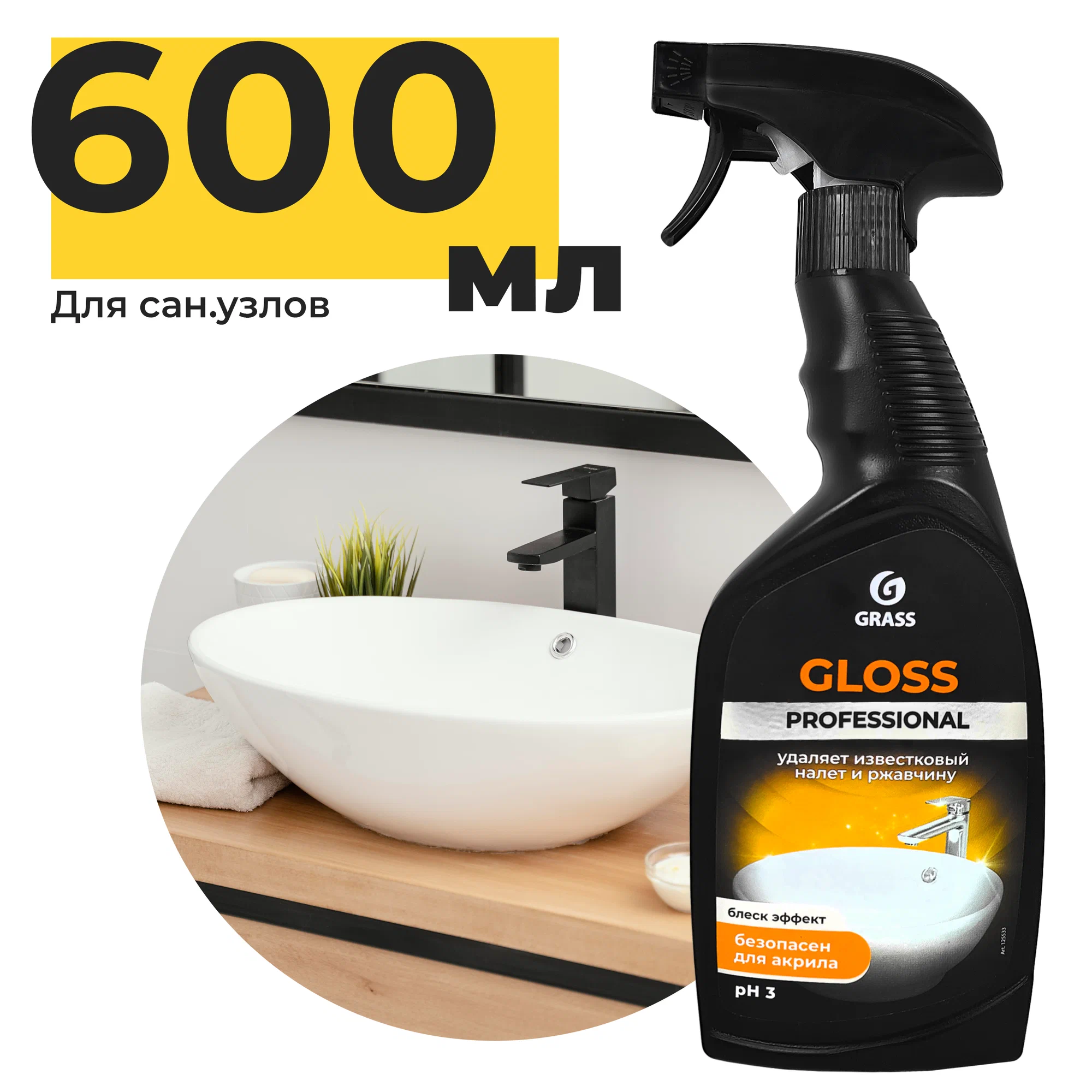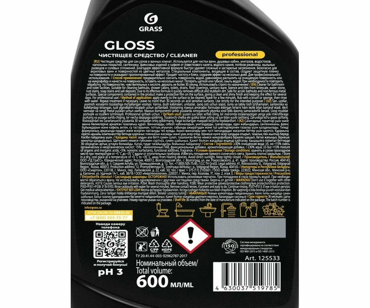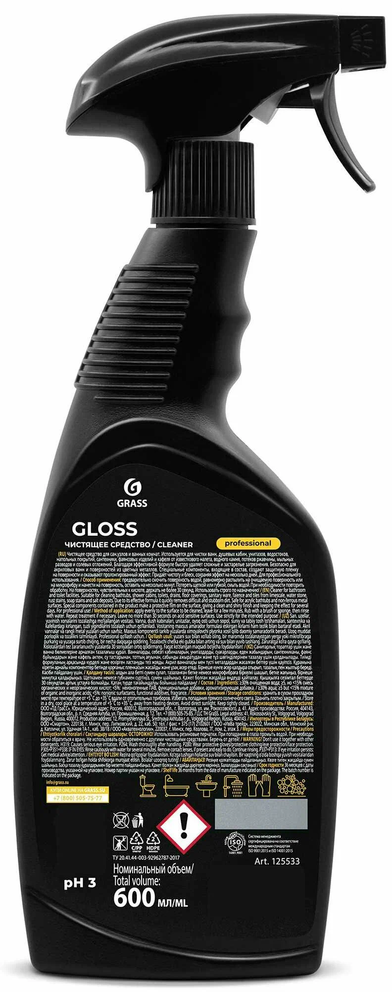 Средство чистящее для санузлов и ванных комнат Gloss Professional 600 мл, удаляет известковый налёт и ржавчину, GRASS.