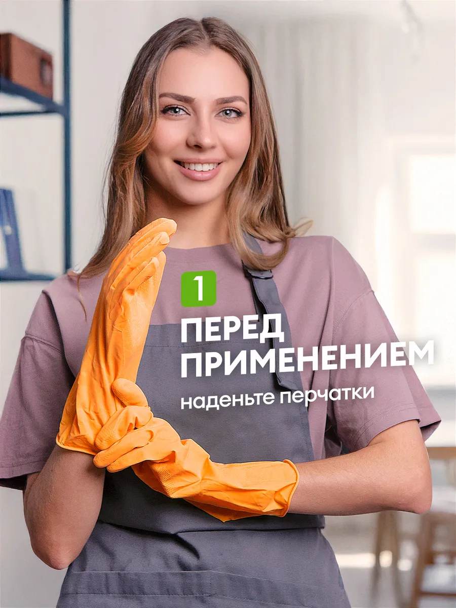 Наденьте резиновые перчатки, распылить средство на поверхность, выдержать на поверхности до 1 минуты.