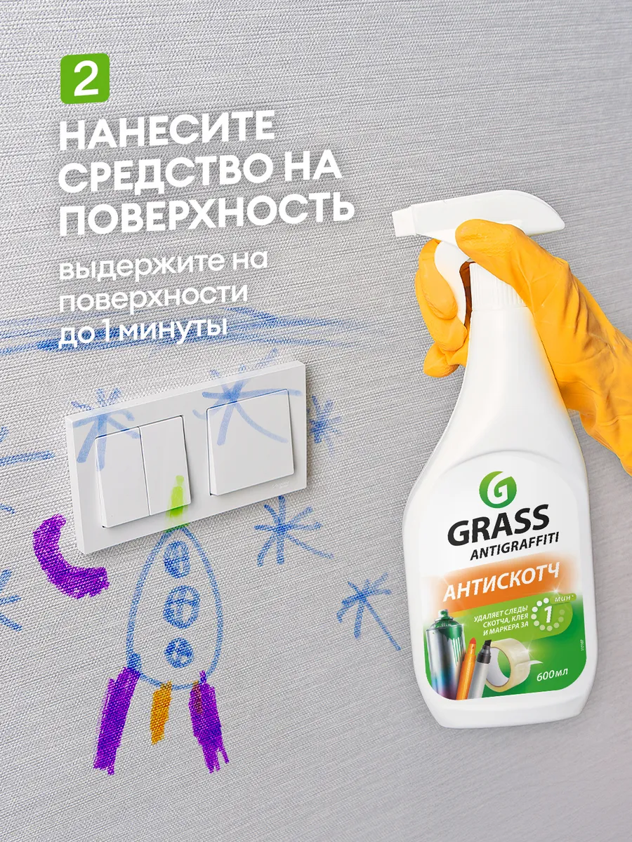 Универсальное чистящее средство анти граффити Antigraffiti 600мл от Grass - предназначено для быстрого и эффективного удаления следов от скотча, жвачки, зелёнки, остатков наклеек, слайма, резины, клея, зелёнки, следов перманентного маркера, карандашей, краски, цветных, шариковых и чернильных ручек, а также граффити с различных поверхностей. Подходит для чистки стен, полов, дивана, потолков, стеклянных поверхностей, ковров, мебели, одежды, обуви и прочего. Cпрей для уборки Антиграффити - облегчит вам очистку труднодоступных мест, точечно нанося средство на место загрязнения, за счёт удобного триггера на флаконе.