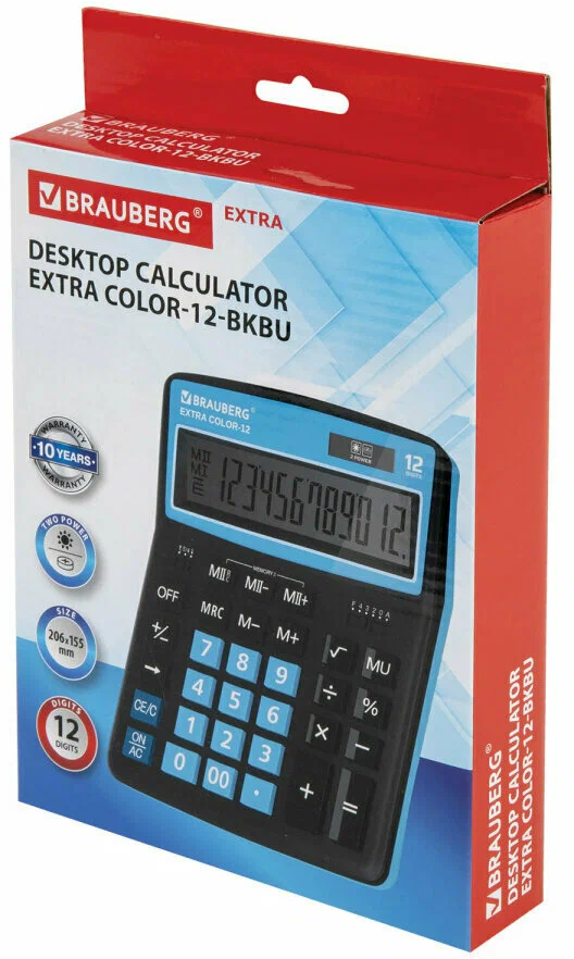 Калькулятор настольный BRAUBERG EXTRA COLOR-12-BKBU, 12 разрядов, 15,5 × 20,6 см, чёрно-голубой.