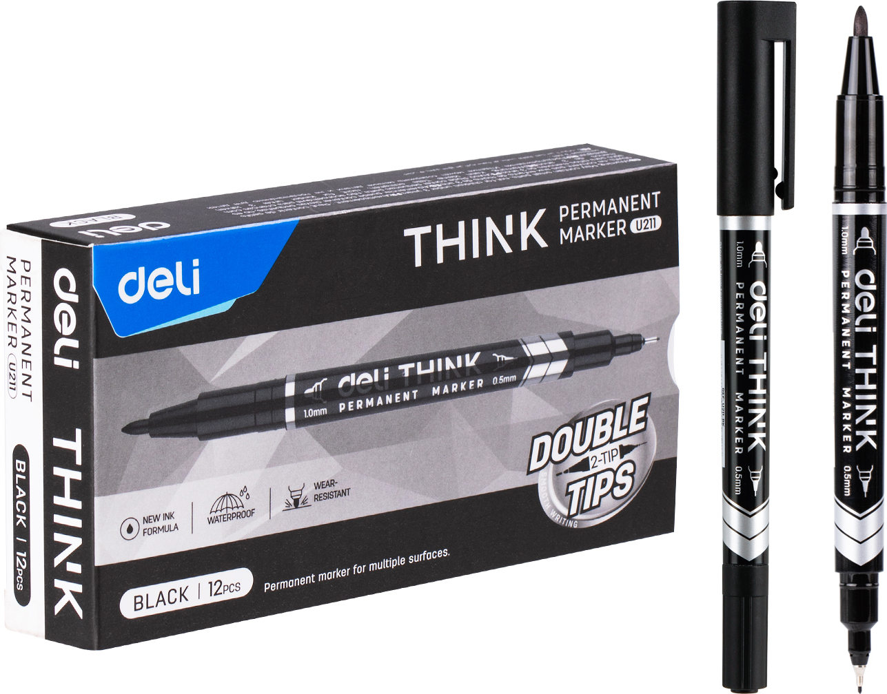 Двусторонний ультратонкий перманентный маркер 0,5-1 мм с чернымми чернилами "Think" от Deli подходит для письма на любых поверхностях.