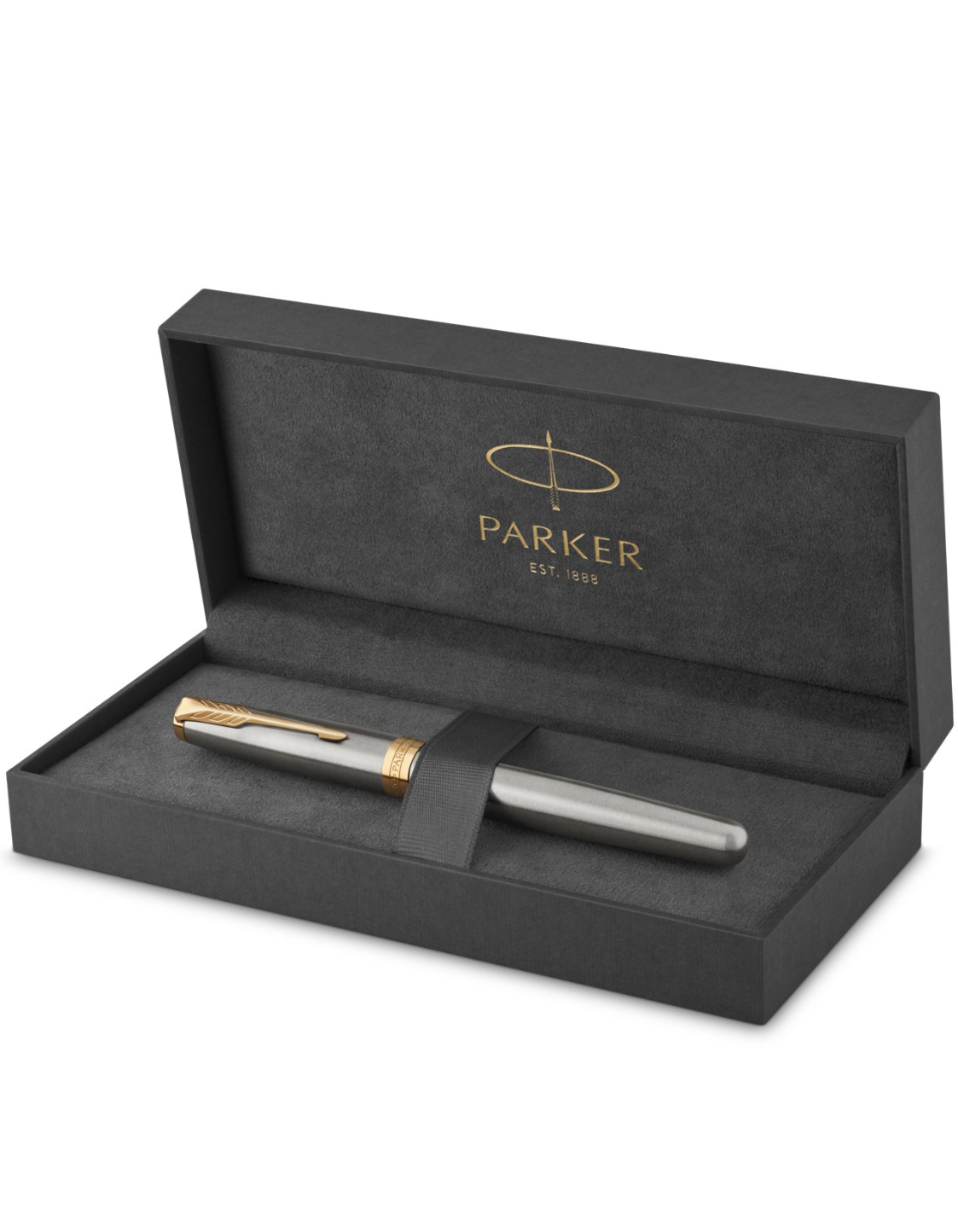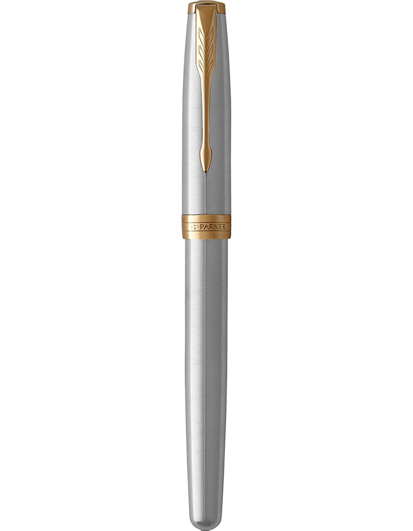 Перьевая ручка Parker Sonnet Stainless Steel выполнена из шлифованной нержавеющей стали и отделана позолоченной латунью.