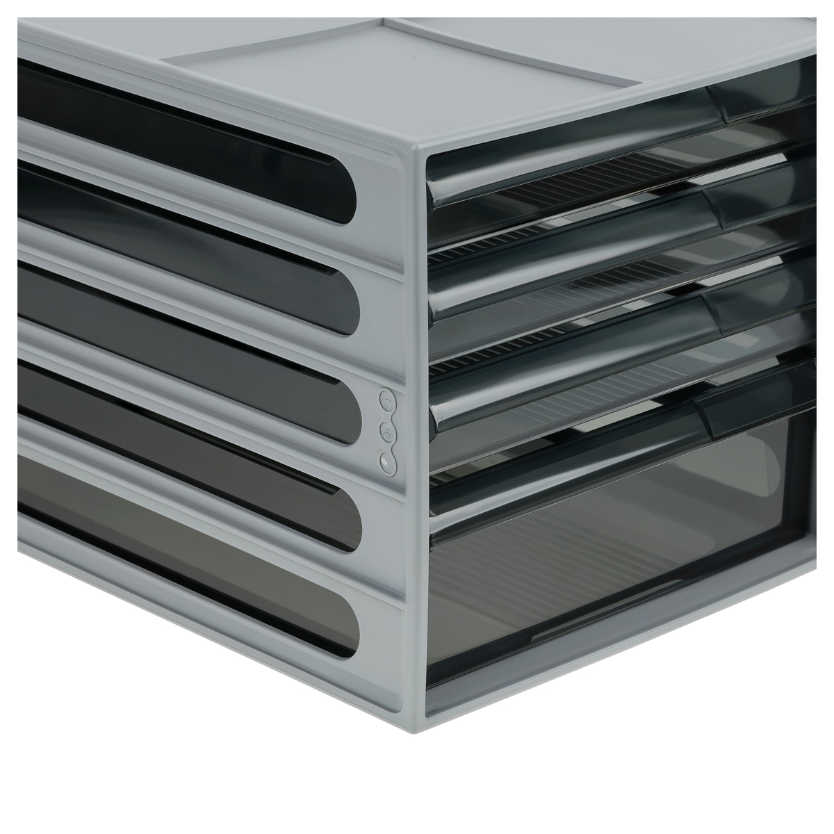 Прочный и устойчивый корпус выполнен из ударопрочного пластика, рассчитан на вместимость до 1100 листов. Сдержанный серый цвет корпуса в сочетании с тонированными чёрными лотками делает блок универсальным решением для офиса и домашнего рабочего пространства.