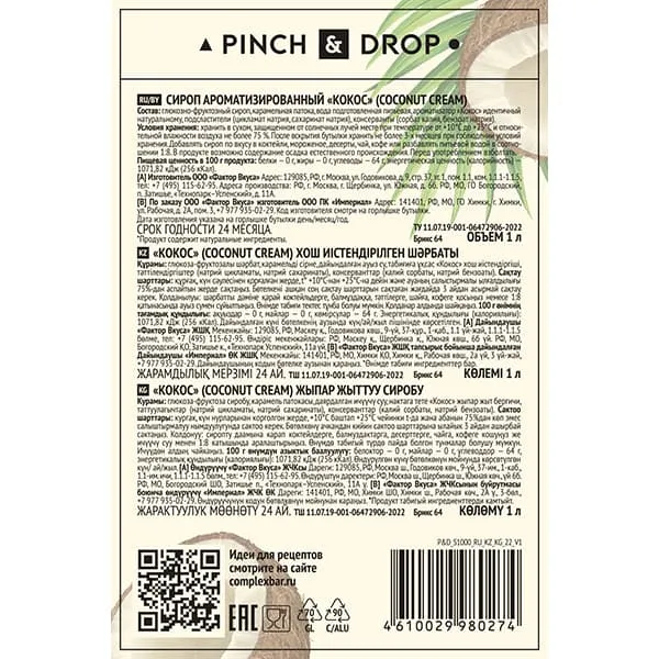 Производитель использует только натуральные компоненты. Производство ведется в соответствии с отечественными стандартами. В итоге клиенты получают великолепный товар с насыщенным вкусом и потрясающим ароматом. Pinch&Drop работает для того, чтобы ваши любимые напитки, десерты и кофе раскрывались новыми вкусами.