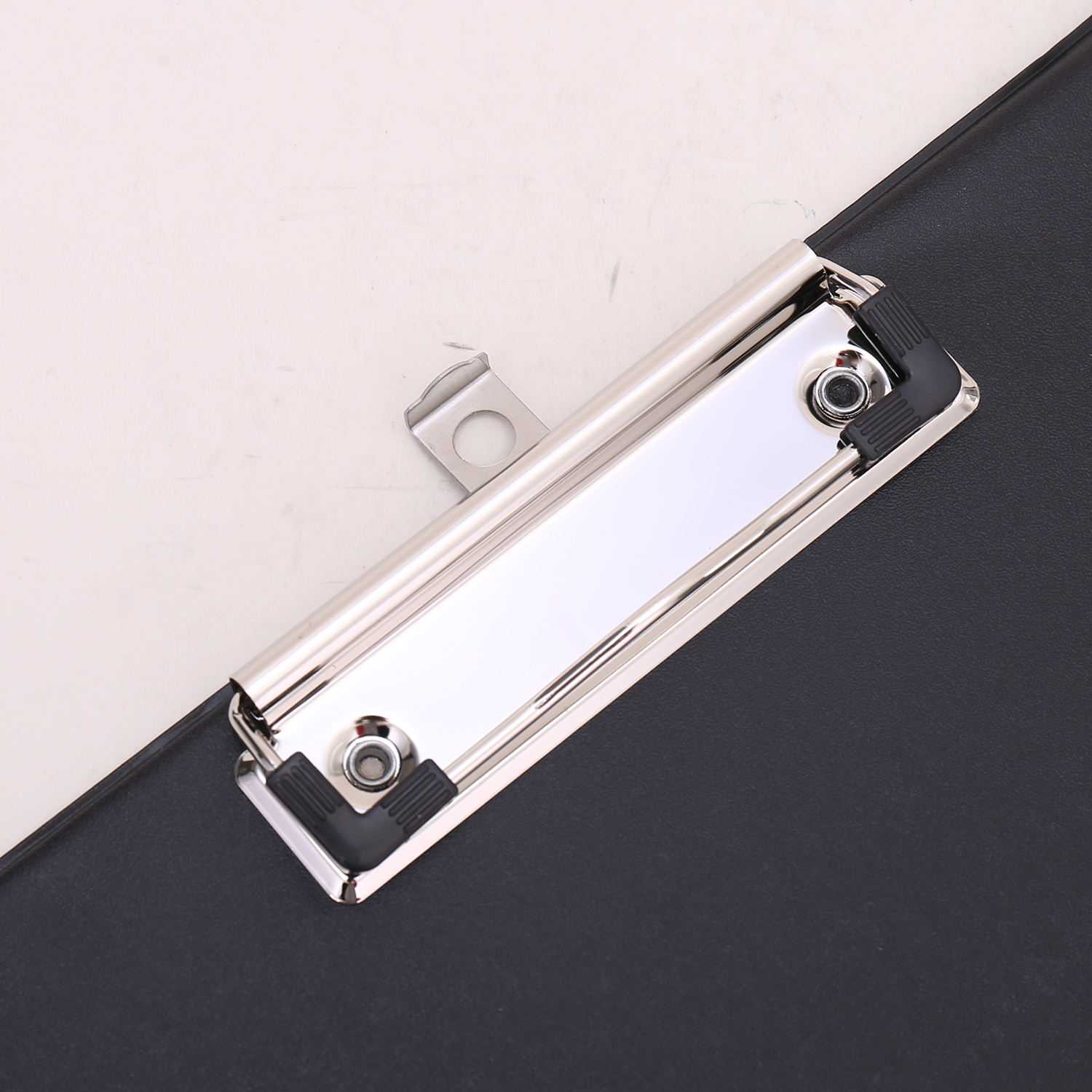 Металлический прижим надежно удерживает листы и файлы.