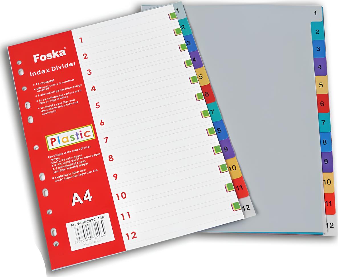 Разделитель 1-12, А4, 12л, пластик, цветной Foska